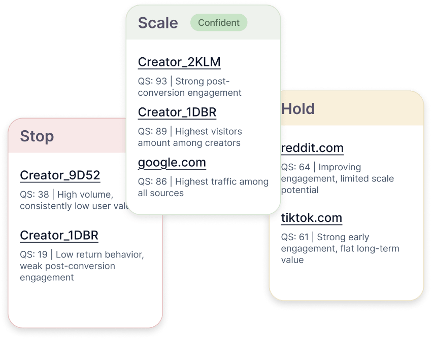OneLence translates long-term user behavior into explicit signals that show which creators and channels to scale, hold, or stop, without manual analysis.